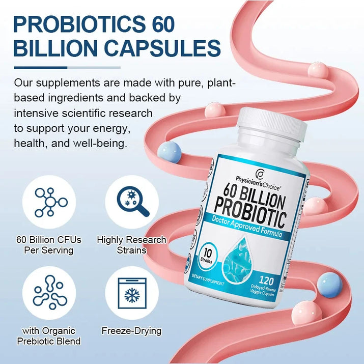 Answer 1: Probiotics, like those in our 60 Billion Probiotics supplement, are designed to support overall digestive health, enhance immunity, and promote gut health. They help maintain a balanced gut microbiome, which is essential for preventing issues like gas and bloating.